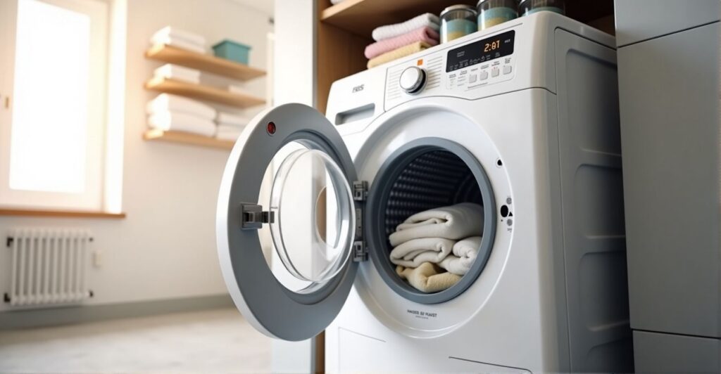 Een warmtepompdroger werkt anders dan gewone drogers. Hij gebruikt een gesloten systeem. De droger blaast geen vochtige lucht naar buiten maar houdt warme lucht binnen. De warmtepomp haalt vocht uit de lucht en hergebruikt de warmte. Dit bespaart tot 70% energie. Je betaalt minder voor stroom en vermindert je CO2-uitstoot met ongeveer 200 kg per jaar – net als 1000 kilometer minder rijden in een gemiddelde auto.